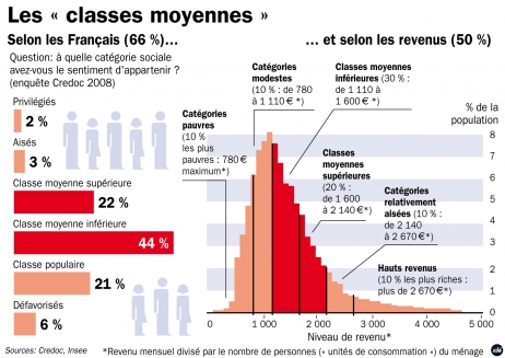 Cet article a pour mérite d’expliquer le concept de « classe moyenne« , et de faire prendre conscience qu’à partir d’un revenu de 4000 Euros, un couple peut être considéré comme inscrit dans la « classe aisée », donc directement soumis aux ponctions fiscales, directes et indirectes, instaurées par le gouvernement de JM Eyrault. C’est aussi d’éveiller la vigilance de chacun/ chacune sur les modifications actuelles et à venir de la fiscalité des revenus du travail, des successions, de l’épargne … thèmes sur lesquels nous reviendrons.