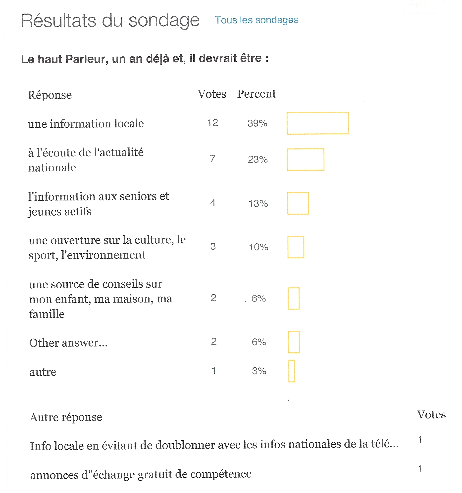 Vous avez été 31 lecteurs de ce site à répondre à ce sondage du week-end, et nous remercions ces participants. Le chiffre est représentatif de l’attente des Montmorencéens en matière de communication, et de l’information que le Haut Parleur peut véhiculer. Nous vous remercions de votre fidélité, et à bientôt