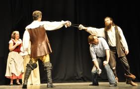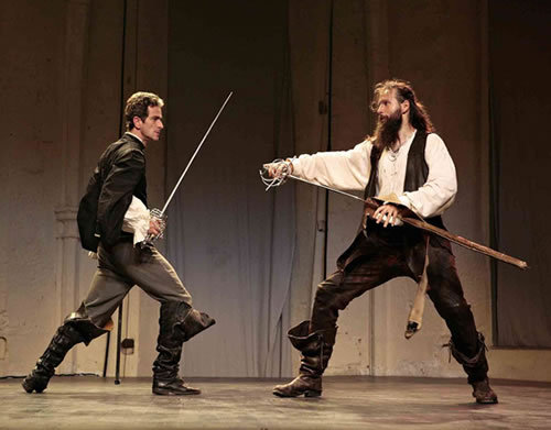 Grégory Bron obtient ainsi un effet « Café de la gare », mais aussi Cyrano qui accompagne tout du long cette pochade héroïque. Le sommet est atteint avec l’intervention d’un spectateur qui, lui, parle en prose et touche par sa maladresse.Ce touriste en tee-shirt s’essaie aux alexandrins, puis à l’escrime sous les yeux médusés des bretteurs.