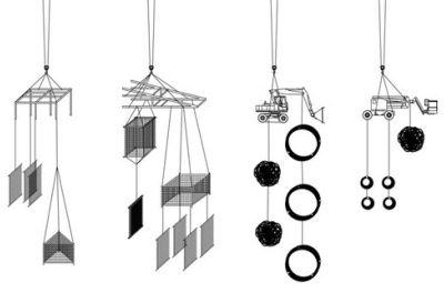 Au-dessus des Halles en travaux, les Frères Ripoulain ont créé un mobile monumental à la manière d’Alexandre Calder : engins et matériaux de chantier seront suspendus à des grues, comme représenté sur ce schéma préparatoire. L’ensemble sera éclairé en contre-plongée par des projecteurs.