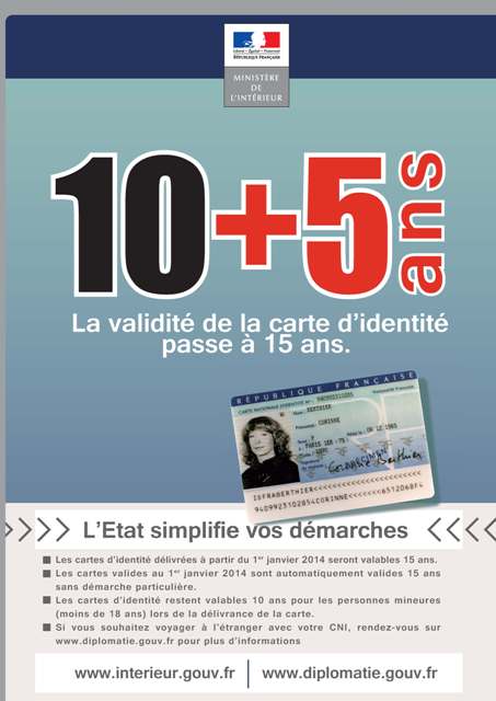 Suite à la publication d’un décret au Journal Officiel du vendredi 20 décembre 2013, la durée de validité des cartes nationales d’identité (CNI) délivrées aux personnes majeures passe de 10 à 15 ans.