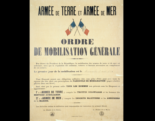 En milieu d’après-midi, le tocsin alerte les populations qui découvrent cette affiche : le président de la République, par décret, ordonne la mobilisation générale, que mettent en œuvre les ministres de la Guerre et de la Marine (l’armée de l’air n’existe pas encore). L’affiche, d’un type imprimé en 1904, est complétée de la date effective, puis placardée par la gendarmerie. Chaque réserviste sait, en consultant son livret individuel de mobilisation, le lieu et le jour auxquels il doit répondre à l’appel.