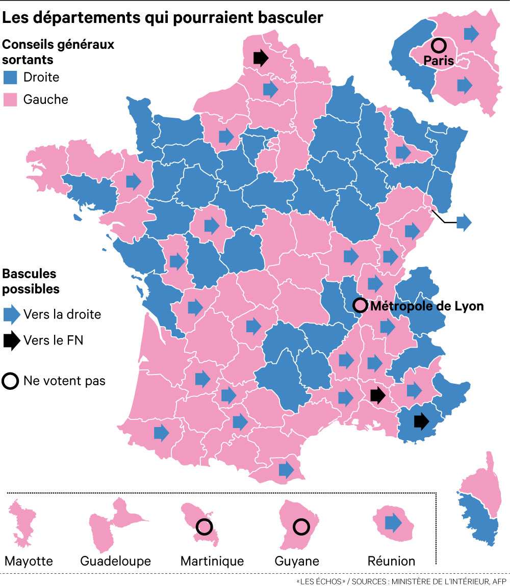 Les élections départementales s’annoncent comme une défaite de plus pour le PS et la gauche et une nouvelle étape en avant du Front national. Mais c’est l’UMP qui devrait tirer les marrons du feu, selon des experts politiques. Quand la gauche contrôle aujourd’hui une soixantaine de départements, sur 101, et la droite une quarantaine, l’UMP ambitionne d’inverser ce rapport de force pour devenir majoritaire. Le FN espère emporter le Var, le Vaucluse, l’Aisne… mais surtout, faire entrer en force de nombreux élus dans les conseils départementaux, lui qui n’en a qu’un.