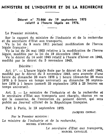 Le changement d’heure tel qu’on le connaît, c’est-à-dire avancer d’une heure en été et reculer de 60 minutes en hiver, date de l’année 1976. Sous la présidence de Valéry Giscard-d’Estaing, le ministre de la Recherche et de l’Industrie de l’époque, Michel d’Ornano, publie un décret le 19 septembre 1975, qui entrera en vigueur quelques mois plus tard.