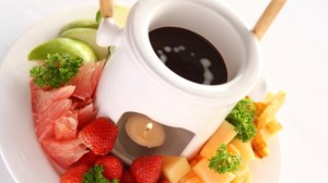 Dans un caquelon à fondue, fais fondre les chocolats et la crème pour obtenir un mélange bien lisse.