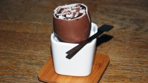 Mets ensuite l’œuf dans un joli coquetier. Remplis-le aux trois-quarts de crème au chocolat.