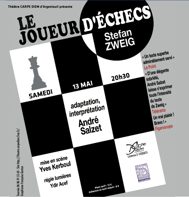 «Le Joueur d’échecs». Ce bijou narratif que l’on dévore comme un polar, raconte la rencontre, sur un paquebot, d’un champion du monde d’échecs inculte et retors et d’un aristocrate aussi mystérieux que redoutable qui a réussi, grâce aux échecs, à résister à la barbarie nazie durant son incarcération. Qui sortira vainqueur de cette confrontation improbable et à quel prix ? C’était un pari risqué de traduire au théâtre le chef-d’œuvre de Stefan Zweig. Yves Kerboul, metteur en scène, en propose une adaptation lumineuse et angoissante, portée par André Salzet, impeccable de justesse et d’émotion.