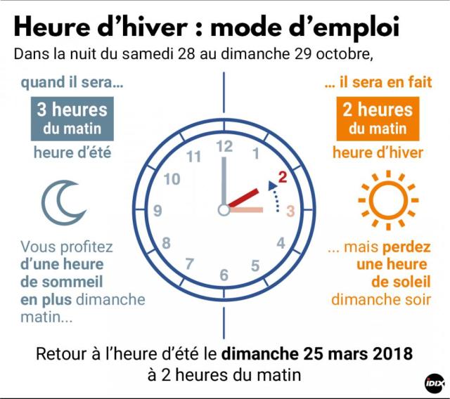 Dans la nuit du samedi 28 au dimanche 29 octobre aura lieu le passage à l’heure d’hiver. A 3 heures du matin, il faudra retirer 60 minutes. Il sera donc 2 heures. Un changement qui permettra à chacun de « gagner » une heure de sommeil, mais qui peut également provoquer des dérèglements de notre biorythme.