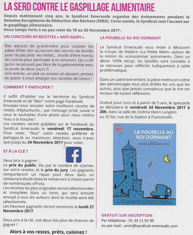 Dans une publication récente éditée par le syndicat émeraude, nous apprenons que le Syndicat Emeraude organise des événements sur le thème de la réduction des déchets