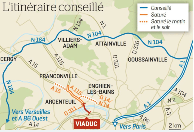 Une déviation est mise en place vers la commune d’Argenteuil. Si vous prenez l’A15 dans le sens province – Paris, il est conseillé d’emprunter la sortie 2 de l’autoroute en direction du centre-ville, puis de rejoindre la D 311 en direction du pont de Bezons, puis la D 392 en direction de Colombes (Hauts-de-Seine) pour enfin rejoindre l’A86 intérieur en direction de Saint-Denis (Seine-Saint-Denis) ou de l’A86 extérieur en direction de Rueil-Malmaison (Hauts-de-Seine).