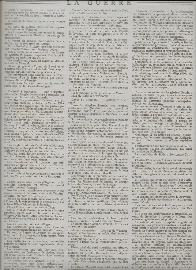 La Justice immanente annoncée par Gambetta au lendemain de nos revers de 1870 s’est levée: l’Allemagne, vaincues dû souscrire le 11 novembre à nos conditions d’armistice qui consacrent la victoire. «