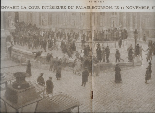 « Cette photo unique (qui) montre le public prenant d’assaut la cour de Bourgogne, tandis que du haut des marches, M. Deschanel annonce que M. Clemenceau préside le Conseil de cabinet ».