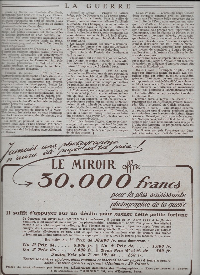 « Lorsque la guerre éclate, Le Miroir colle au climat enthousiaste et optimiste des débuts », dont le travail de recherche est à l’origine de cette exposition. Les chefs y posent dans leur uniforme et l’on vante le confort des tranchées. Jusqu’à ce que le journal décide de lancer un concours de photographie. L’idée, pas nouvelle, a abondamment été utilisée avant-guerre pour nouer un lien avec le lecteur. Dès le 9 août 1914, Le Miroir promet de « payer n’importe quel prix les documents photographiques relatifs à la guerre présentant un intérêt particulier ». Le 14 mars 1915, il offre 30 000 francs – « 24 années de salaire d’un mineur », pour la photographie « la plus saisissante ».