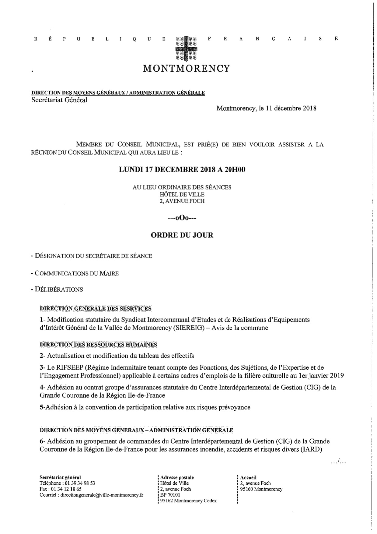 Ville de Montmorency – Prochain Conseil Municipal le lundi 17 Décembre 2018