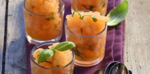 Épluchez le melon, retirez les pépins et mixez-le en purée fine avec l’huile d’olive. Versez dans un bac plat et placez au congélateur en mélangeant avec une fourchette toutes les 20 minutes jusqu’à l’obtention d’un granité.