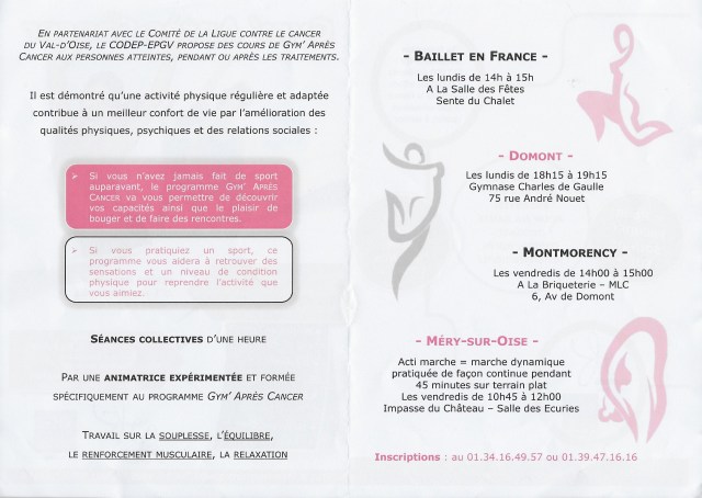 Face au fléau du cancer et aux conséquences dramatiques de ses traitements sur le corps (mutilations, fatigue, douleurs musculaires, articulaires, crampes, essoufflement, etc), l’activité physique a vraiment un rôle à jouer dans le maintien d’une condition physique et dans la restauration d’une image corporelle, tous deux favorables à la vie après le cancer. Ce sont actuellement plus de 700 personnes qui pratiquent 2 à 3 séances par semaine, en salle et en extérieur.