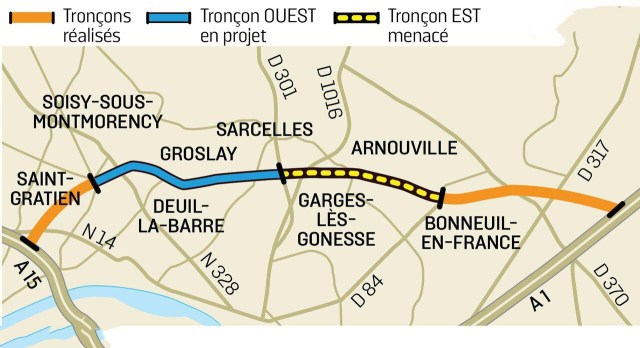 Une partie du tronçon, déjà en service, relie jusqu’à présent Sannois à Soisy-sous-Montmorency. Pour expliquer sa décision, la cour d’appel de Versailles a mis en avant le manque d’information sur les conditions de financement de ce projet porté par le département et évalué à 146 millions d’euros.