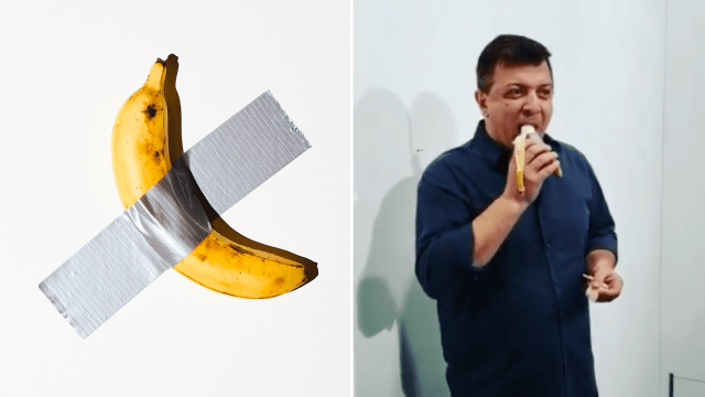 « Comedian », oeuvre de Maurizio Cattelan, a été tout simplement mangée par un autre artiste, David Datuna. Un quart d’heure plus tard, une nouvelle banane était scotchée au mur.  (RHONA WISE / EPA)