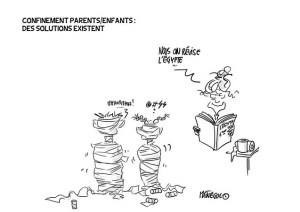 Mercredi 18 mars. Premier jour à quatre à la maison. Journée ensoleillée, les enfants ont pu profiter du jardin. Pas encore de nouvelles de la maîtresse, j’imagine qu’il faut le temps de s’organiser. Ce midi, apéritif en famille, jeux l’après-midi ; Mathilde avait fait un gâteau au chocolat pour le goûter. Petit air de vacances !