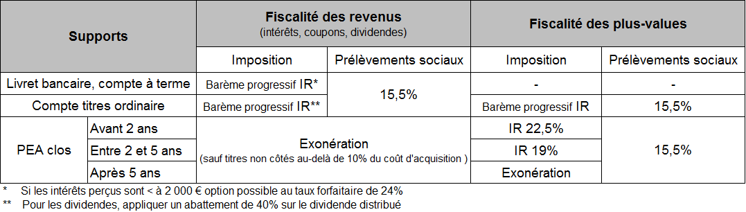 Par ailleurs, les foyers ayant perçu moins de 2.000 euros d’intérêts dans l’année pourront encore opter pour le prélèvement forfaitaire libératoire à 24 %. L’option est exercée lors du dépôt de la déclaration des revenus perçus au titre de la même année. En outre, les intérêts sont assujettis aux prélèvements sociaux au taux de 15,5 %. Toutefois, au regard de l’impôt sur le revenu, la CSG prélevée sur les revenus mobiliers est déductible à hauteur de 5,1 % du revenu global.