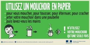 On oublie les mouchoirs en tissu à carreaux que nos grands parents utilisaient, et on se mouche dans un mouchoir à usage unique, que l’on ne laisse surtout pas traîner, et que l’on jette dans une poubelle bien évidemment !